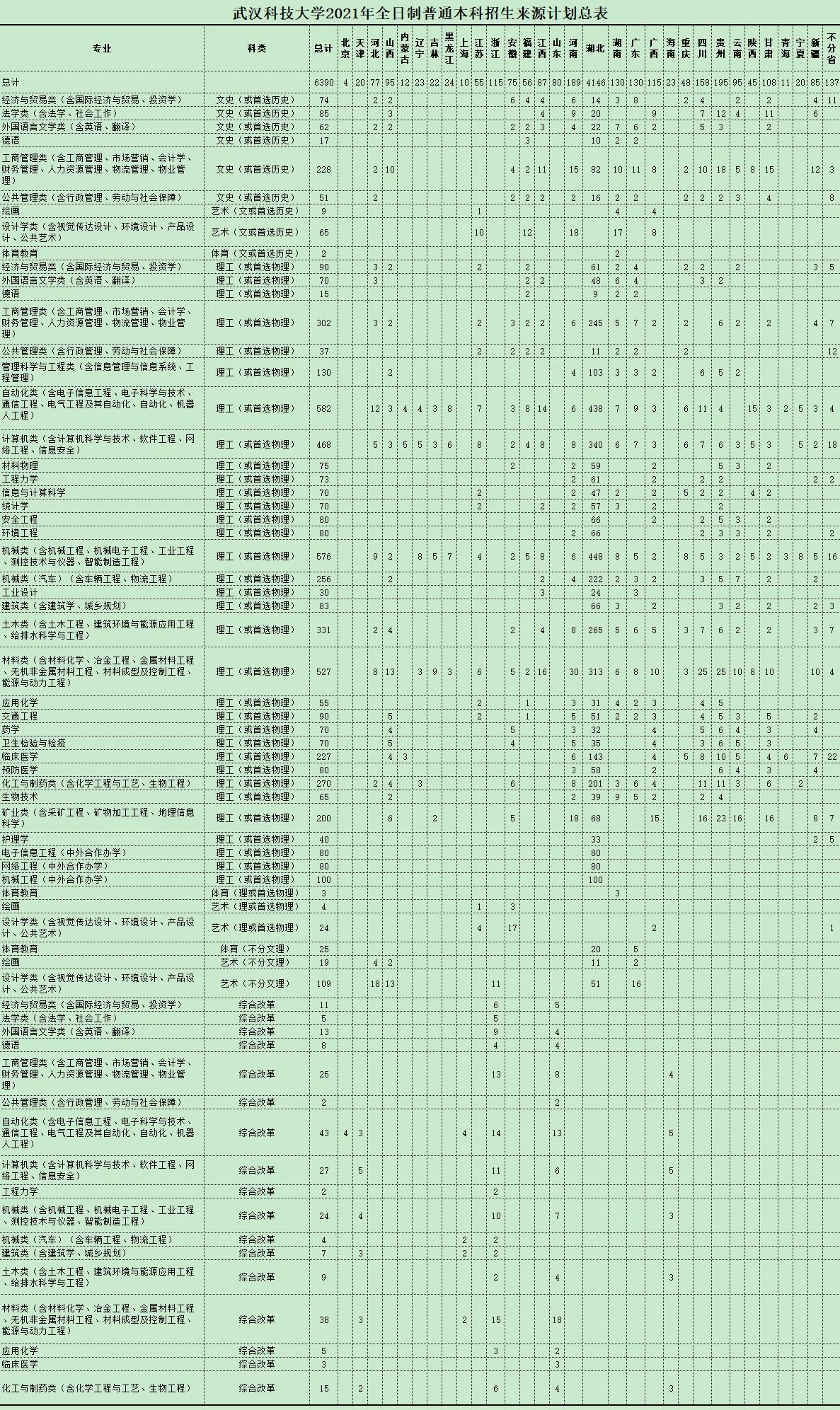 武汉科技大学2021年全日制普通本科招生来源计划总表