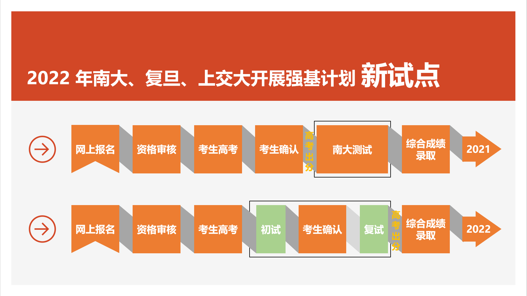 今年,南京大学与复旦大学、上海交通大学将联合开展强基计划招生新试点。最大的变化是高校考核由高考出分后调整至出分前完成。南大考核由初试和复试两个环节组成。对第一类考生,初试通过者才能进入复试。复试按照考生报考专业所在专业组分类进行。高考成绩公布后,我们将按照高考成绩和南大考核成绩计算的综合成绩进行录取。