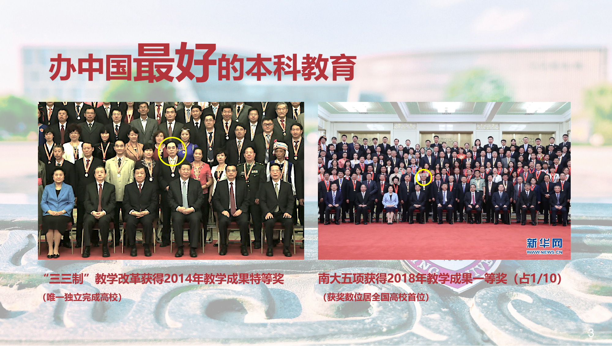 南京大学始终致力于“办中国最好的本科教育”。“三三制”本科教学改革荣获2014年国家级教学成果奖特等奖,并于2018年再获国家级教学成果奖一等奖五项,获奖数量占总数十分之一,位居全国高校首位。