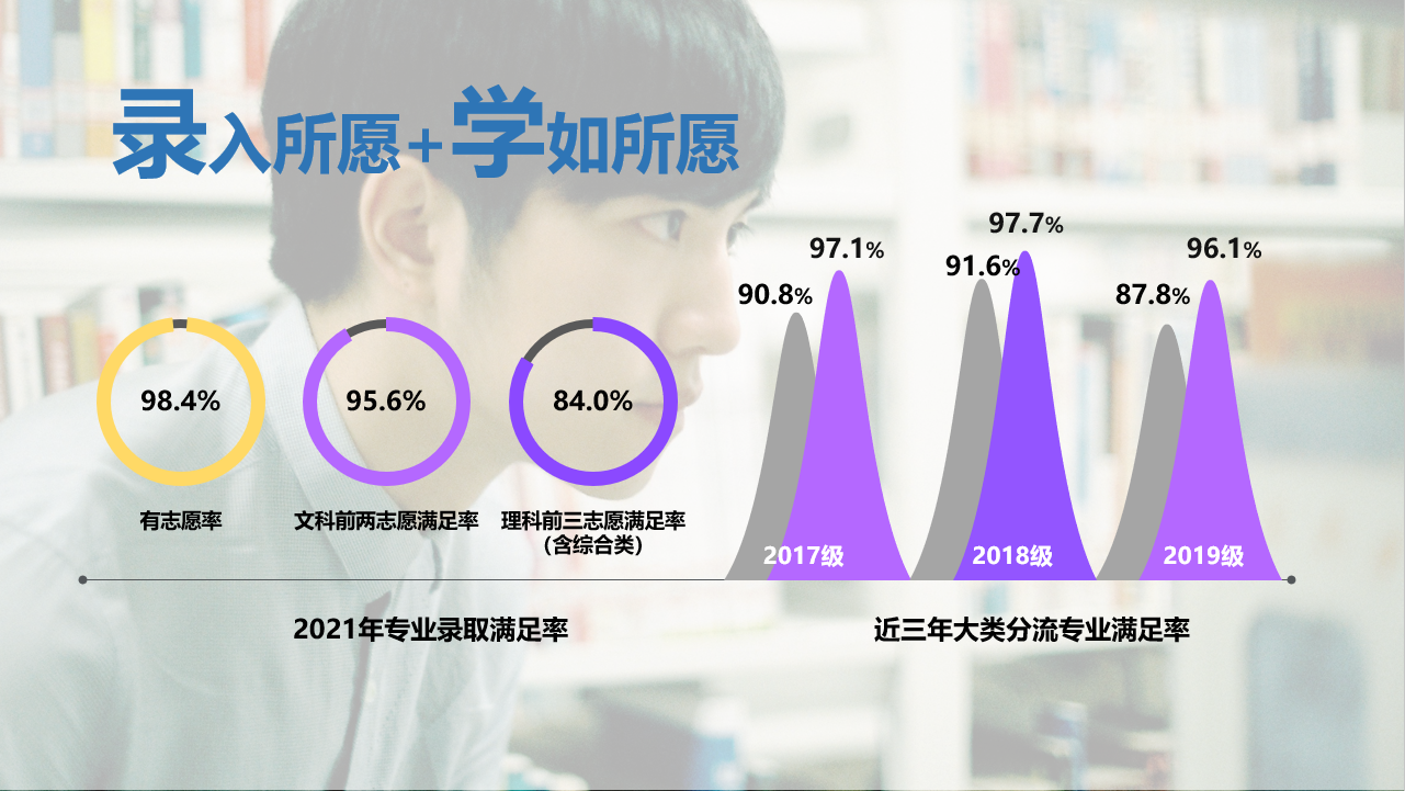 办学空间扩大后,南京大学将雄厚的办学实力和领先的培养模式进一步拓展,开启多校区本科“一体化”培养。将“一切以学生发展为中心”的办学理念落实到各个校区和招生培养各个环节。2021年普通批次录取,考生有志愿率达到98.4%,其中文科前两志愿满足率95.6%,理科前三志愿满足率84%。近年来,经过一年大类培养后分流,一志愿满足率在90%左右,二志愿满足率97%左右。学生在课程、专业和发展路径100%可选择的培养体系中追逐梦想,挑战自我。